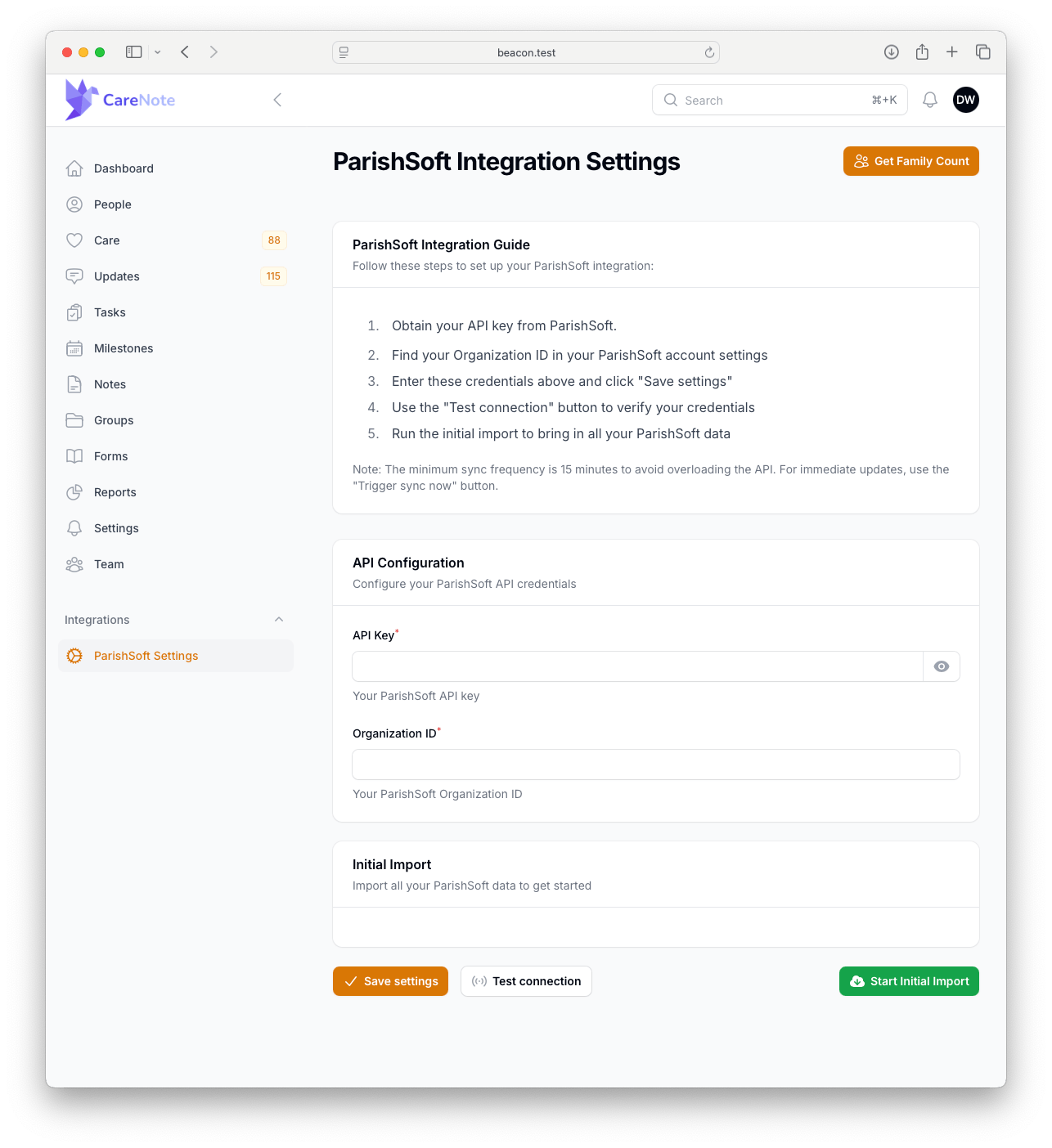 After speaking directly with the ParishSoft team, including their Vice President of Software, we charted a path forward. Each parish needs its own API key (a $200 purchase from ParishSoft), but once that API key is secured, the rest is straightforward. CareNote now supports direct integration with ParishSoft.
