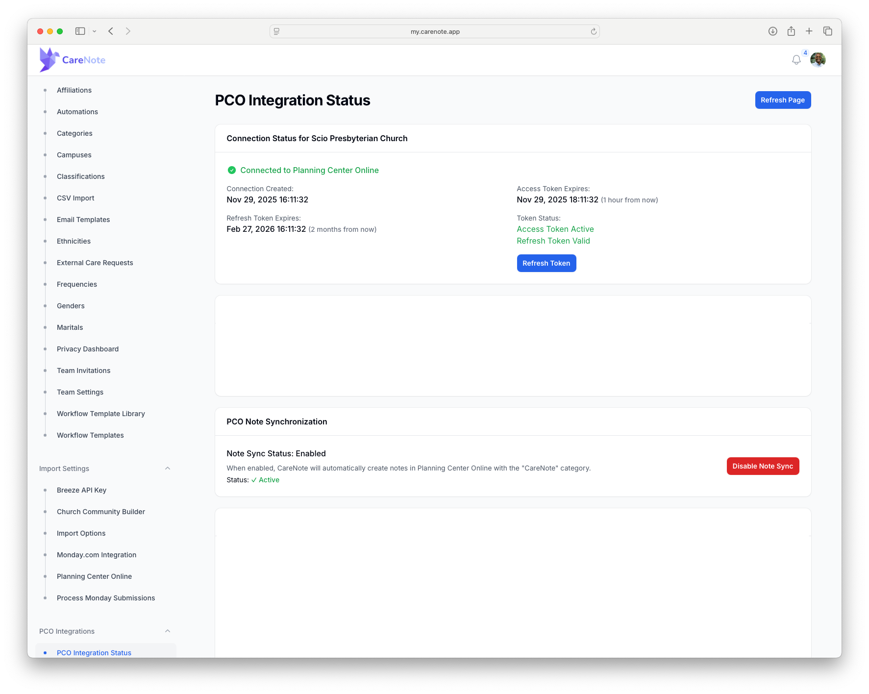 CareNote now includes a one-way note sync feature with Planning Center Online (PCO). Enable this integration with just a few clicks to automatically push all new notes and updates written in CareNote to your Planning Center account—no manual copy-paste required.